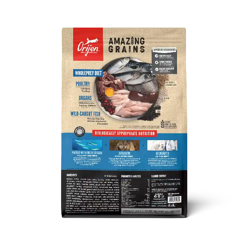 ORIJEN Amazing Grains is packed with fresh or raw animal protein and enhanced with hand-selected grains to give your dog peak nourishment. With 90%* premium animal ingredients, ORIJEN Original with Amazing Grains includes WholePrey ingredients from free-run chicken and turkey, and wild-caught fish. These nutrient-dense animal ingredients provide your dog with the protein, vitamins and minerals they need to thrive. This diet includes only the most amazing grains in a high-quality blend of oats, quinoa and chia and more, hand-selected to provide a balanced fiber ratio that helps support your dog’s digestive health.