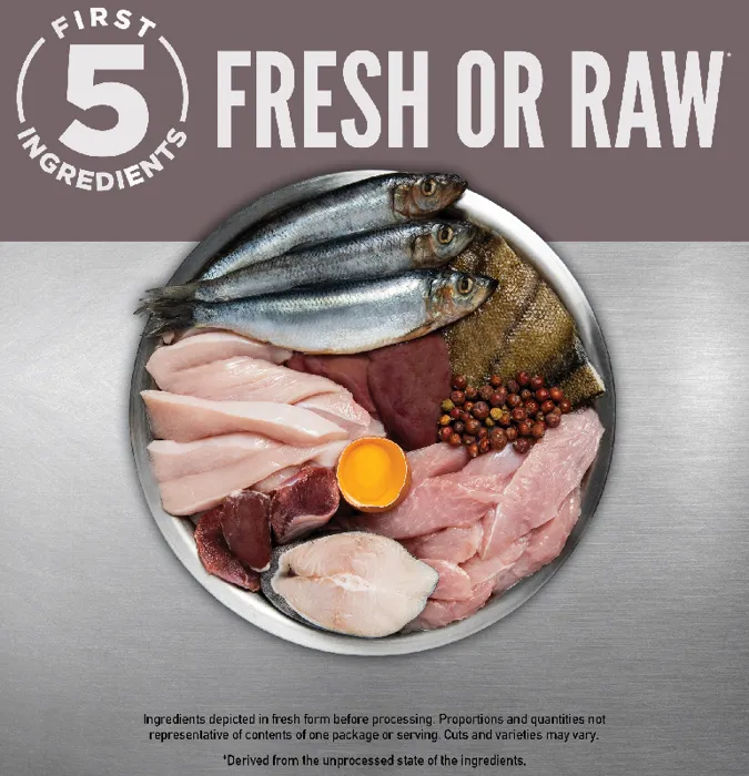 - Offers a rich diversity of fresh and raw meats; 85% meat inclusions, 15% veggies & fruits, and 0% grain, tapioca, or plant protein concentrates