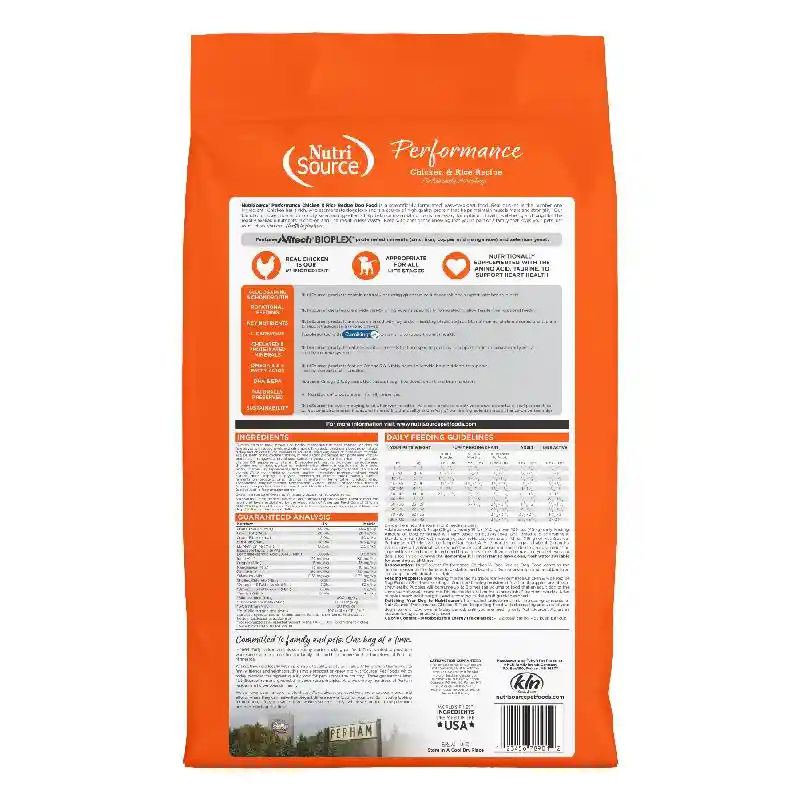 NutriSource® Performance Chicken and Rice formula is ideal for all breeds and all life stages. NutriSource® Performance Chicken and Rice formula delivers premium nutrition in a holistically formulated, easy-to-digest food. Our Performance dog food is often considered the best value in any store across the nation, pound for pound when it comes to cost, quality ingredients and our unsurpassed Alltech supplements (Good 4 Life) - there is no equal! We combine low-ash chicken meal, humanely certified chicken, rice, and carefully selected holistic ingredients to promote balanced growth and unparalleled health for your special friend. Health of your beloved pet is our #1 priority and our unmatched use of Good 4 life supplements guarantees the new addition to your family won't have any runny stool issues and a healthier immune system, we guarantee it. Bio-availability is important to your pets long-term health so we created a highly digestible, nutrient dense morsel with +85% digestibility rating. With NutriSource® you can feed less and get more nutrition - Health begins here!. NutriSource®Performance Chicken & Rice Formula Dog Food is formulated to meet the nutritional levels established by the Association of American Feed Control Officials (AAFCO) Dog Food Nutrient Profiles for all life stages except for growth of large size dogs (70 lbs. or more as an adult). NutriSource® foods can ensure maximum bioavailability - All the nutrition necessary for a happy, healthy life.