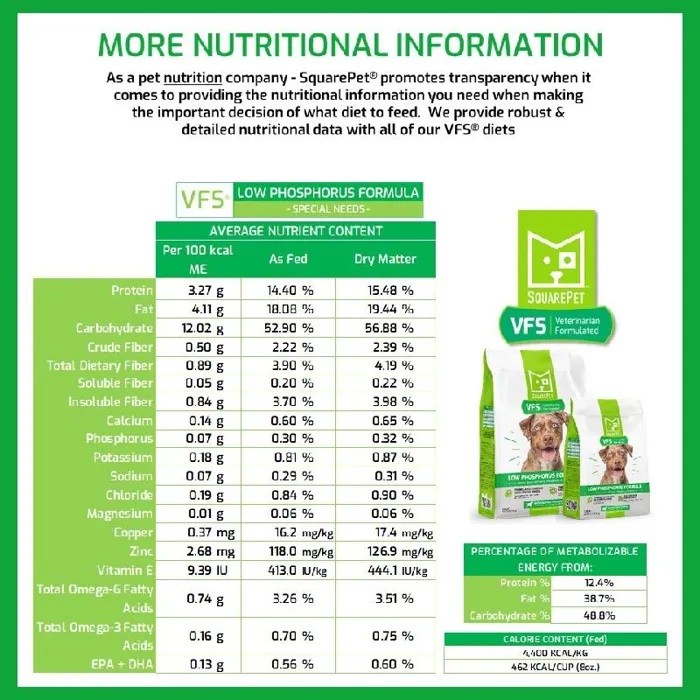 SquarePet® VFS® Low Phosphorus Formula has been developed by SquarePet’s team of veterinary professionals to support dogs who may benefit from a high quality, all-natural low protein, low phosphorus and low sodium dog food.
