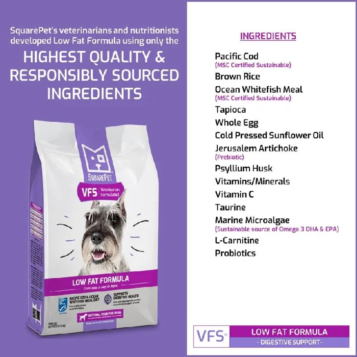 SquarePet® VFS® Low Fat Formula has been developed by SquarePet’s team of veterinary professionals to support digestive health. VFS® Low Fat Formula is made with naturally lean Ocean Whitefish to create a highly palatable and easily digestible low fat dog food.