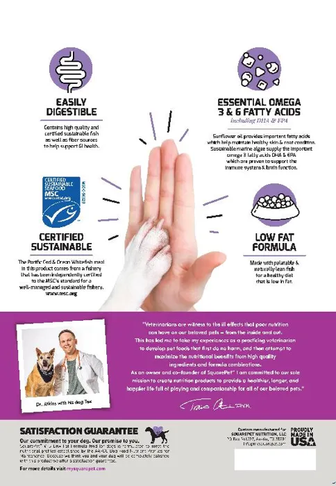 SquarePet VFS Low Fat Formula has been developed by SquarePets team of veterinary professionals to support digestive health. VFS Low Fat Formula is made with naturally lean MSC Certified sustainable and wild caught Pacific Cod and Ocean Whitefish Meal to create a highly palatable and easily digestible low fat dog food. Size