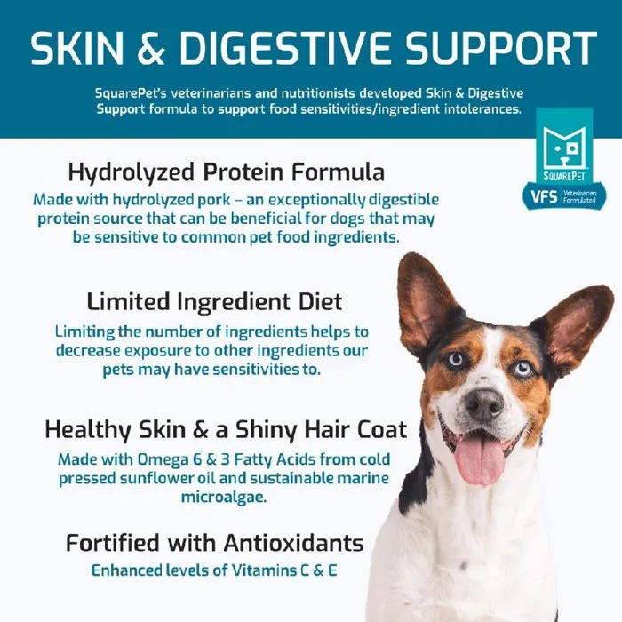 SquarePet® VFS Skin & Digestive Support formula has been designed by SquarePet’s team of veterinary professionals to support food sensitivities/ingredient intolerances. VFS Skin & Digestive Support formula for dogs is a unique, limited ingredient, hydrolyzed protein dog food. Similar to proteins used in some infant formulas, hydrolyzed proteins are proteins that have been broken down into smaller components. The result is an exceptionally digestible protein source that can be beneficial for dogs that may be sensitive to common pet food ingredients.