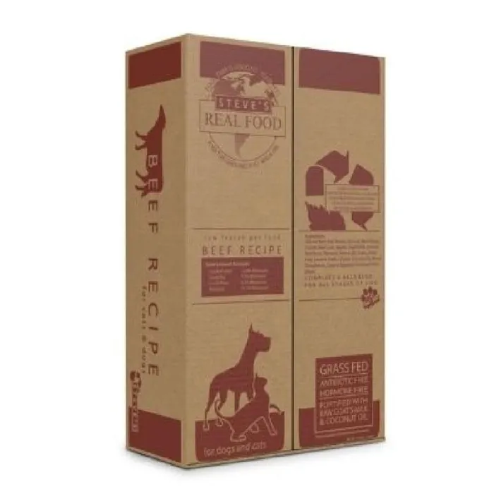 Steve’s Real Food Frozen Raw Dog Food Beef Diet is made from grass-fed, grass-finished beef. This is by far our most popular frozen raw dog food, delivering high-quality nutrition and irresistible taste. This raw beef dog food is a complete and balanced diet for all life stages. It is a BARF formulation composed of 80% meat/organ/bone, 15% produce, and 5% value-added ingredients such as New Zealand Green Lipped Mussel, coconut oil, and raw goat milk that provides everything your pet needs to promote strong bones, muscles, and organ function.