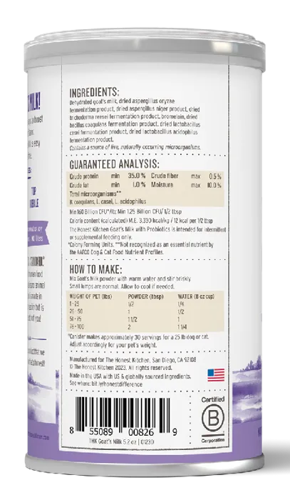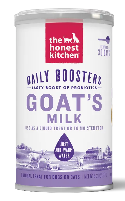 Goat's Milk is immune and digestive support for pro ball-fetchers and yarn-swatters. Its our own all-natural goats milk formula with a whopping 5 billion active probiotics and digestive enzymes, so its good for your pet and their gut. Daily Boosters can be poured onto kibble, used to hydrate The Honest Kitchen food, or served on its own as a deliciously nutritious drink that doesn't come with any nasty pesticides or growth hormones. Perfect as a bedtime beverage!