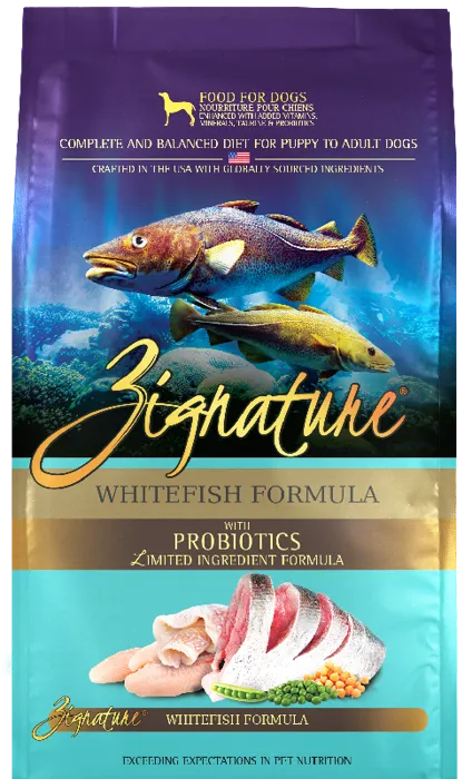 Zignature Limited Ingredient Whitefish Formula Dry Dog Food is grain free, potato free, chicken free and provides your dog with the best whitefish formula for a sensitive digestive system. Feed them the best with Zignature!