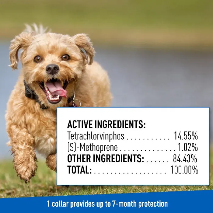 * Kills and repels fleas, ticks, flea eggs, flea larvae and kills tick larvae and tick nymphs.* Water-resistant design continues to work for seven months of formidable pest protection.* Active ingredient spreads from the collar through oils and hair to cover the entire body.* Offers a great, long-lasting alternative to monthly topical flea treatments.* Small size is designed for small dogs and puppies; excess can be cut off.