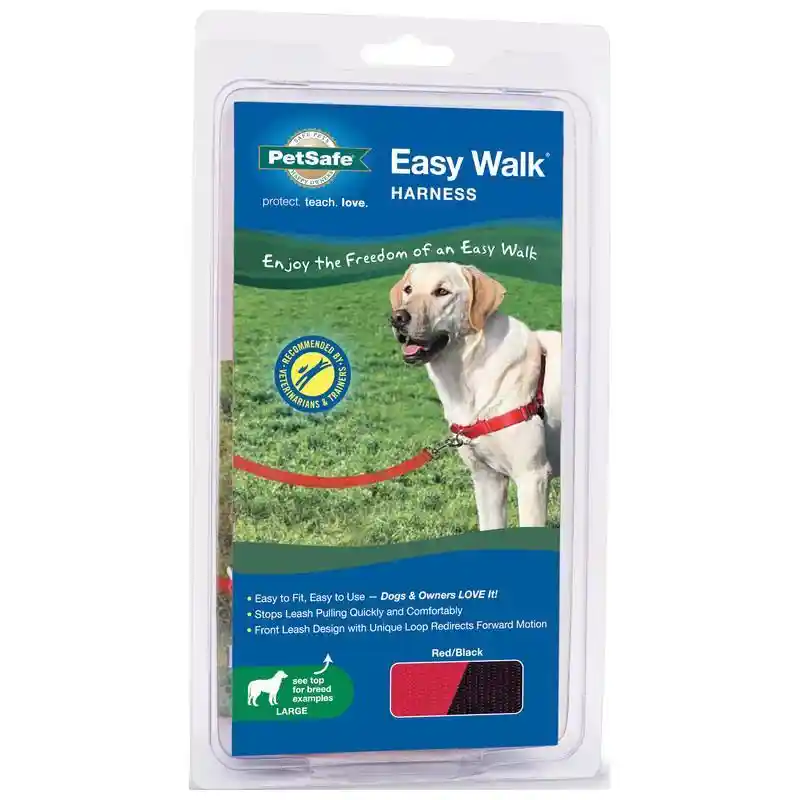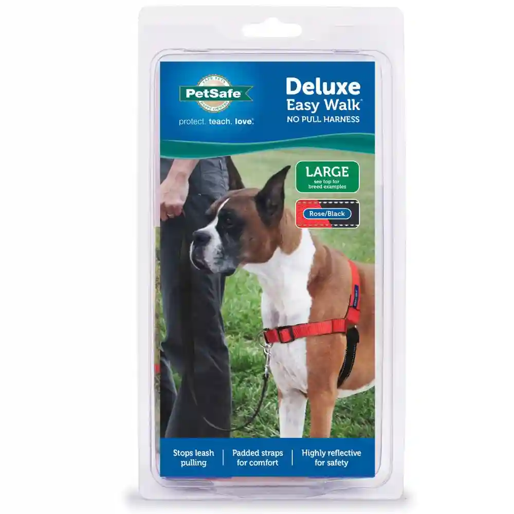 Easy to fit and comfortable to wear, the PetSafe® Deluxe Easy Walk® Harness gently discourages your dog from pulling on the leash. The front-chest leash attachment helps you steer your dog to the side and redirect his attention toward you. The Deluxe Easy Walk® Harness provides the same great benefits as the traditional version, but has additional features such as neoprene lined straps and highly visible, reflective strips.