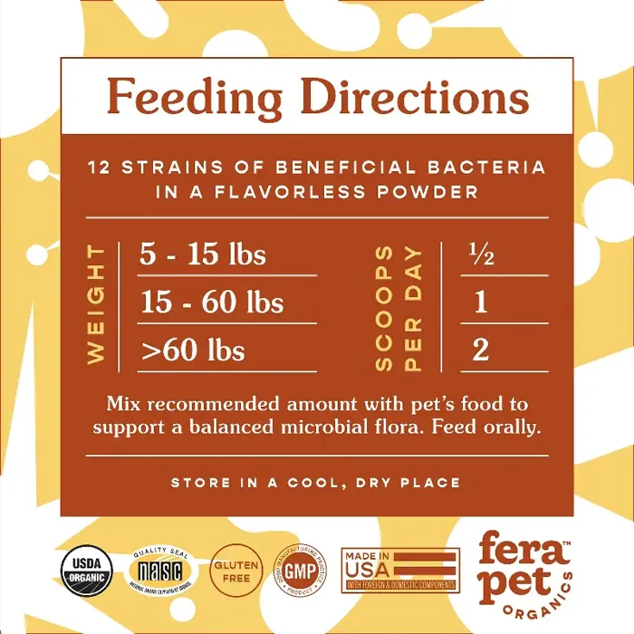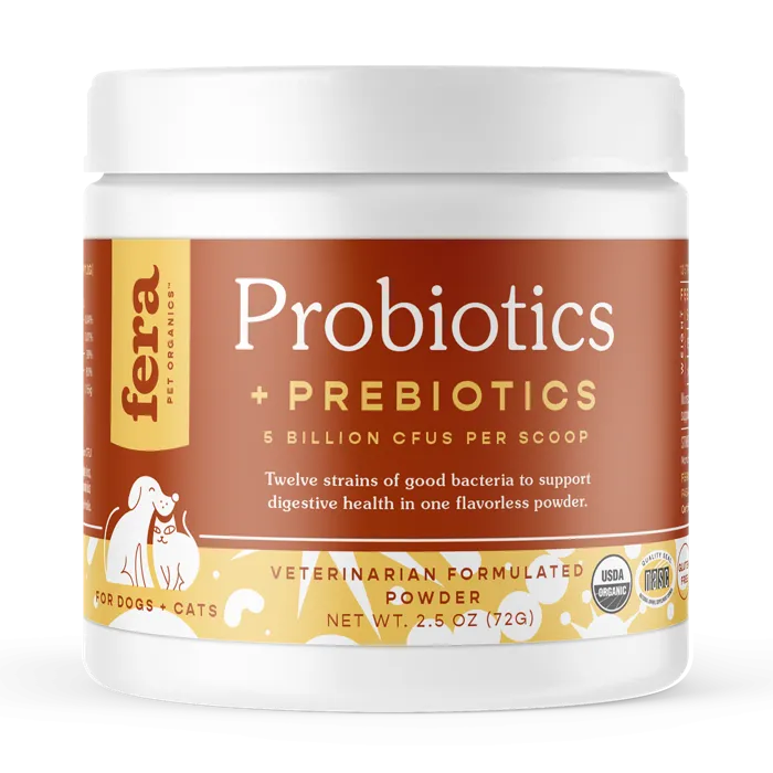 Tummy aches, loose stool, gas, low energy—it always hurts to see our pets suffer from chronic or periodic intestinal issues. It’s why we created Fera’s Probiotics + Prebiotics to keep your pet's digestive system humming along perfectly.