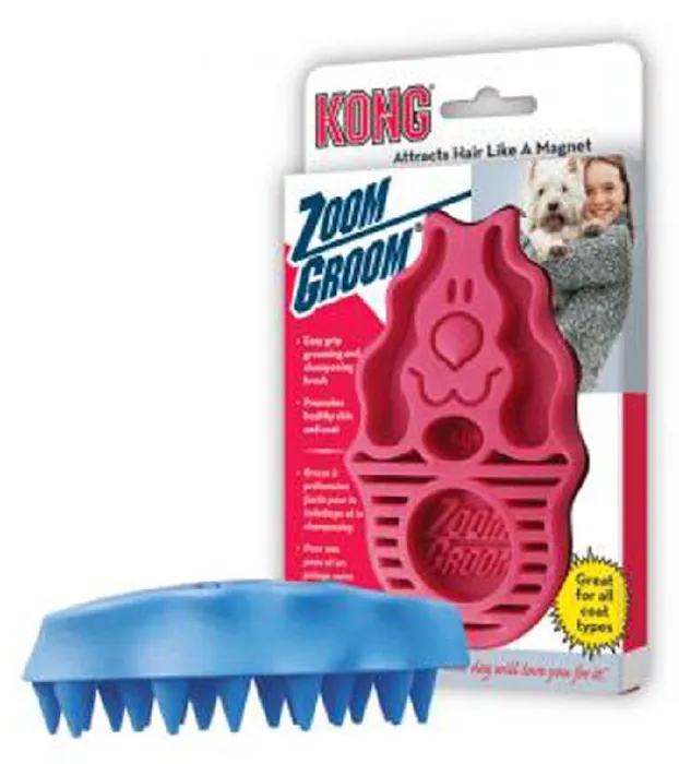 The Zoom Groom is a ultra-gentle rubber brush, effective for all coat types. ZoomGroom will remove loose hair and reduce shedding, attracting loose hair like a magnet! Available in red and blue.