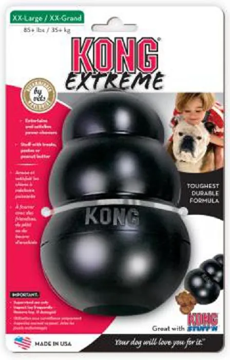 The KONG Extreme dog toy represents the most durable strength of KONG rubber. Designed for the toughest of chewers, the KONG Extreme offers enrichment and helps satisfy dogs’ instinctual needs. The KONG unique, ultra-durable, natural rubber formula is designed for determined chewers, while the erratic bounce fulfills a dog’s need to play. Want to extend play time? Be sure to stuff with tempting bits of kibble and entice with a dash of peanut butter. Add to the fun by adding KONG Snacks and top with KONG Easy Treat. Stuff and Freeze for a longer-lasting challenge.