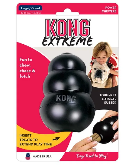 The KONG Extreme dog toy represents the most durable strength of KONG rubber. Designed for the toughest of chewers, the KONG Extreme offers enrichment and helps satisfy dogs’ instinctual needs. The KONG unique, ultra-durable, natural rubber formula is designed for determined chewers, while the erratic bounce fulfills a dog’s need to play. Want to extend play time? Be sure to stuff with tempting bits of kibble and entice with a dash of peanut butter. Add to the fun by adding KONG Snacks and top with KONG Easy Treat. Stuff and Freeze for a longer-lasting challenge.