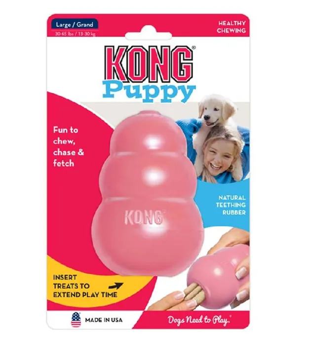 The Puppy KONG dog toy is customized for a growing puppy’s baby teeth, the unique, natural rubber formula is the most gentle within the KONG rubber toy line. Designed to meet the needs of a puppy’s 28-baby teeth, it helps teach appropriate chewing behavior while offering enrichment and satisfying a younger pup’s instinctual needs while the erratic bounce make it ideal for those pups that just want to play. A stuffed Puppy KONG occupies busy little ones while allowing pet parents the freedom to attend to their unique needs. Want to make crate training easier or extend play time? Be sure to stuff with puppy kibble and a dash of peanut butter. Add to the fun by including KONG Puppy Snacks and top with KONG Puppy Easy Treat.