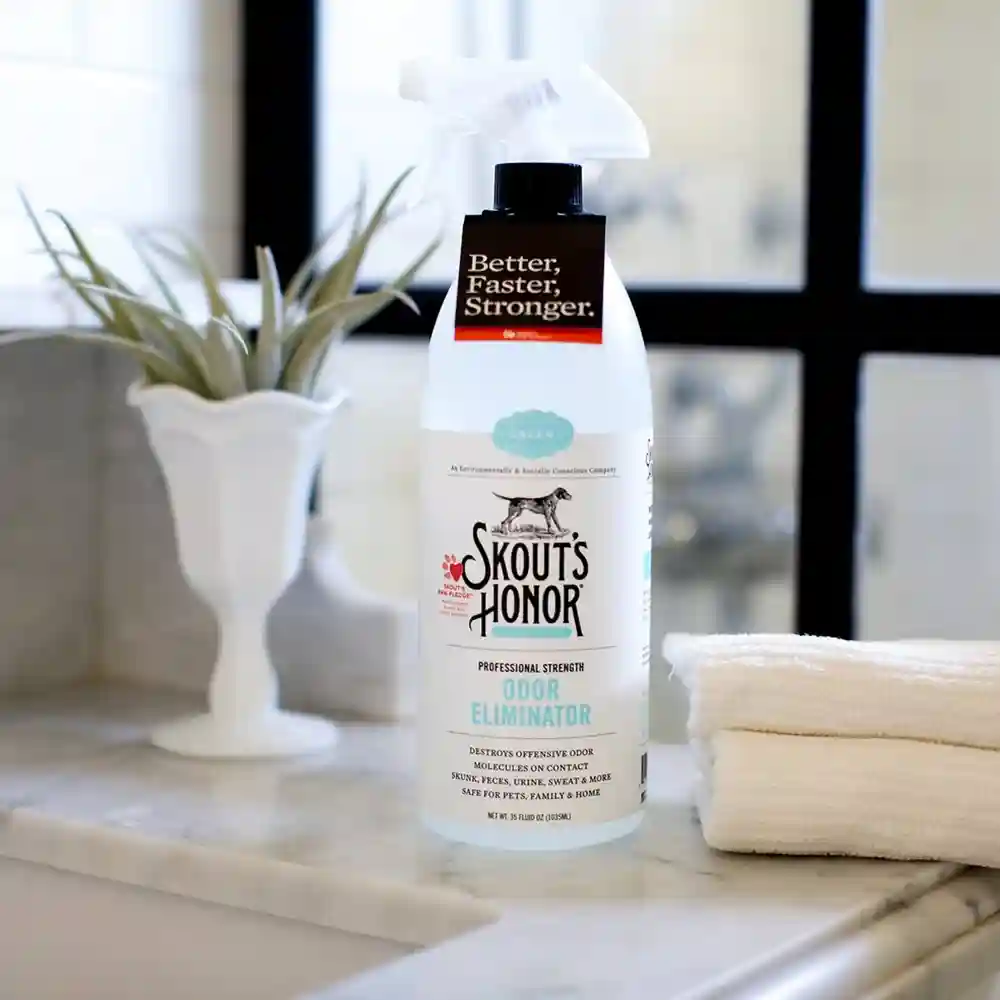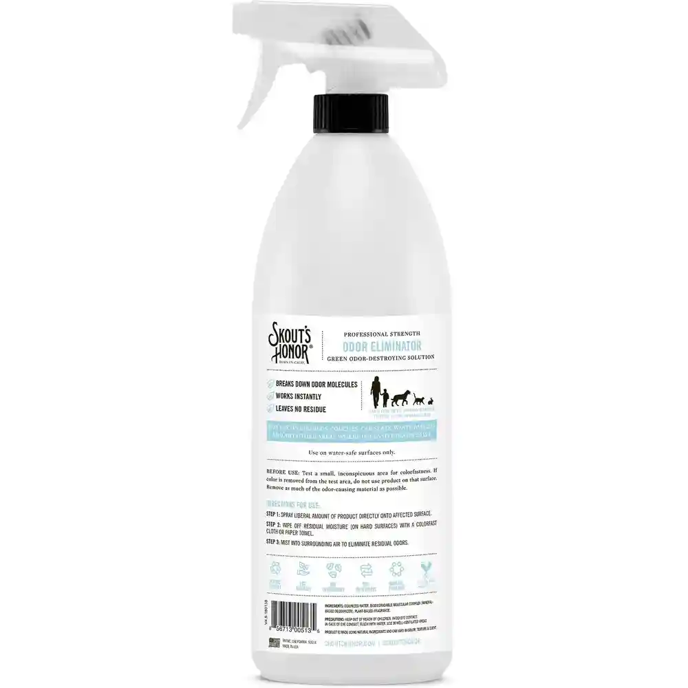 Keep your home smelling fresh with Skout's Honor Professional Strength Odor Eliminator. This hard-working spray uses proprietary odor eliminating technology to instantly destroy odor molecules without any harsh chemicals. The eco-friendly composition is great for dog beds, litter boxes, skunk scents, feces, urine, sweat and any other offensive odors that pets leave behind. Made in the USA, this easy-to-use odor eliminator is a safe and non-toxic cleaning option to keep your home fresh, pleasant smelling and ready for the next stinky mess.