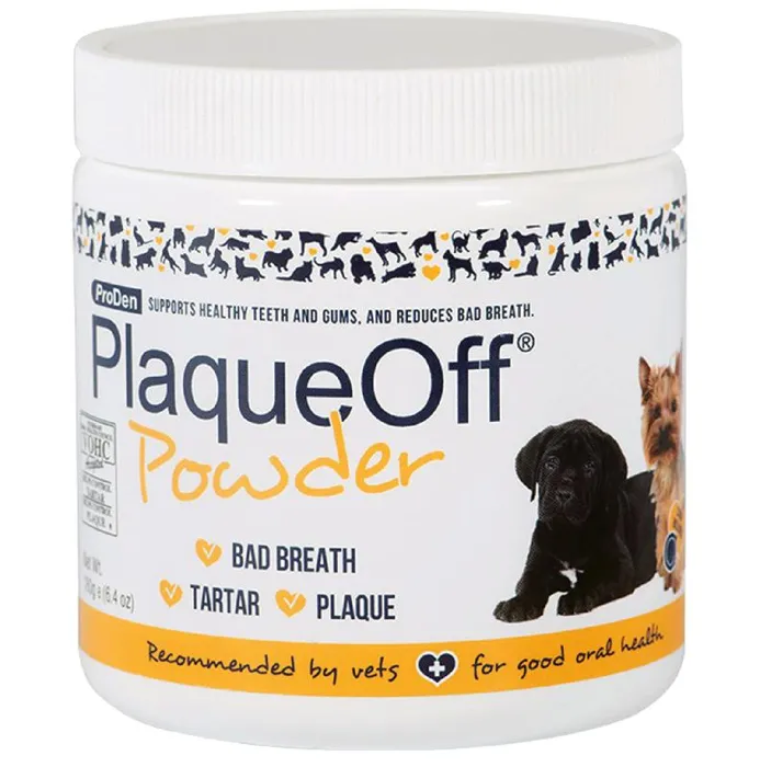 ProDen PlaqueOff® Powder is a 100% natural pet food supplement containing the natural and organic kelp ingredient A.N ProDen® – shown in clinical trials to help reduce plaque and tartar and to help improve bad breath. Sprinkle the powder over the dog’s ordinary food, wet or dry, once a day with the supplied scoop. For a 22lb dog, a 60g bottle lasts roughly 6 months.