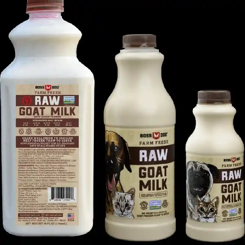 Safe Handling Guidelines : Boss Dog Brand Raw Goat Milk is sold frozen and should be stored in the freezer prior to use. Defrost by placing bottle in the refrigerator for 24 hours. Natural separation of the milk will occur, simply shake well prior to feeding. Once defrosted, Boss Dog Brand® Raw Goat Milk will last 10 days in the refrigerator or 1 year frozen. As with all of our raw products, we recommend a slow introduction of new food products for any pet. Try starting with ½ of the daily feeding quantity.