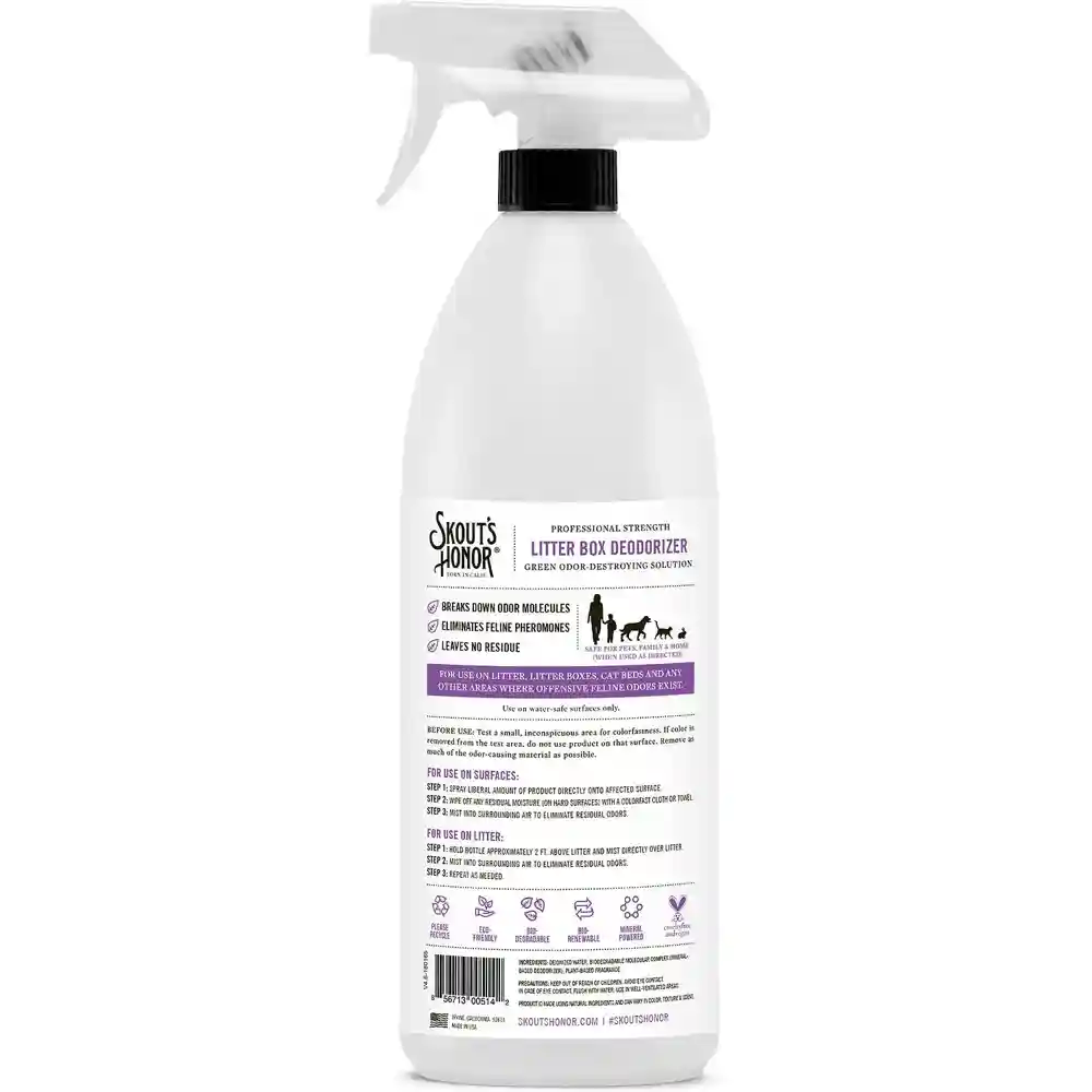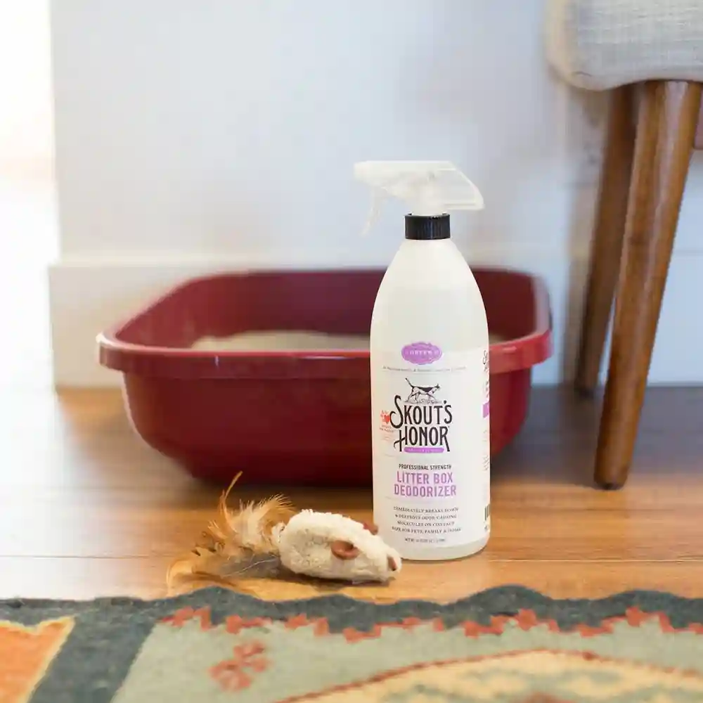 Keep your home smelling fresh with Skout's Honor Professional Strength Litter Box Deodorizer. This hard-working spray uses proprietary odor eliminating technology to instantly destroy odor molecules without any harsh chemicals. The eco-friendly composition is great for dog beds, litter boxes, skunk scents, feces, urine and any other offensive odors that pets leave behind. Made in the USA, this easy-to-use odor eliminator is a safe and non-toxic cleaning option to keep your home fresh, pleasant smelling and ready for the next stinky mess.