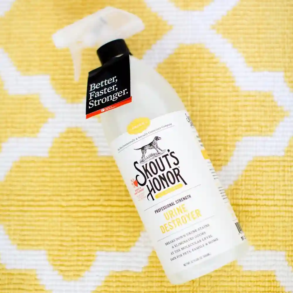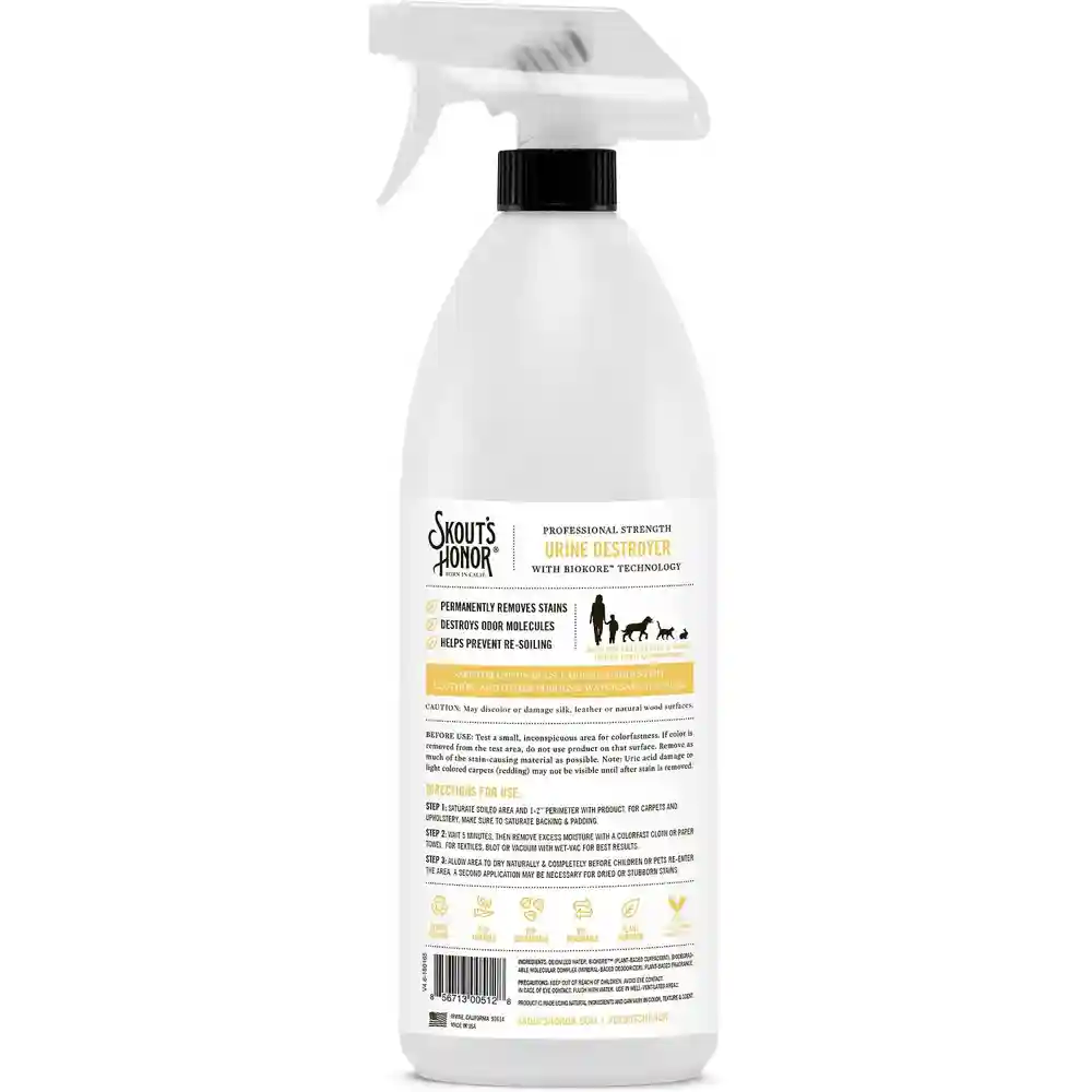 Keep your home clean with Skout's Honor Professional Strength Urine Destroyer. This hard-working spray performs fast to break down and eliminate both old and new pet urine stains and odors at the molecular level. This eco-friendly spray is safe for use on rugs, carpets, upholstery and clothing for a versatile but strong cleanser. The BioKore technology breaks down the stain while the odor eliminating technology destroys those pungent molecules for a fresh clean scent. Together, these eco-friendly solutions will keep your home unstained and ready for the next slip-up.