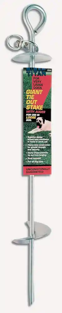 Best suited for sandy or loose ground, the Titan Dog Tie Out Stake provides a solid and secure place to attach your cable tie out so your dog can enjoy the outdoors with peace of mind. Heavy duty construction ensures strength and security.