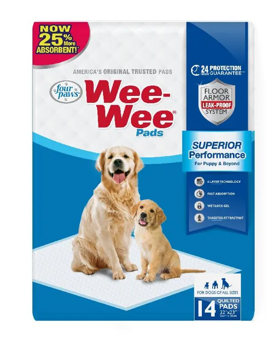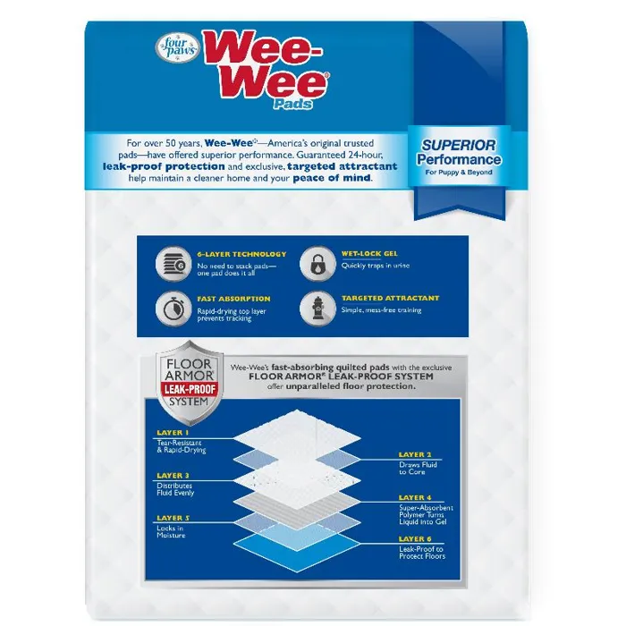 Keep your pup’s mess off of your floor with Four Paws Wee-Wee Absorbent Pads for Dogs. Featuring a 6-layer Floor Armor leak-proof system, these quilted pads are very absorbent and perfect for training both puppies and senior dogs of all sizes. They also contain a wet-lock gel that quickly traps urine with a targeted attractant to draw your dog to the pad. Oversized quilted pockets allow for maximum absorption making these pads from Four Paws as a great solution when you can’t be home.