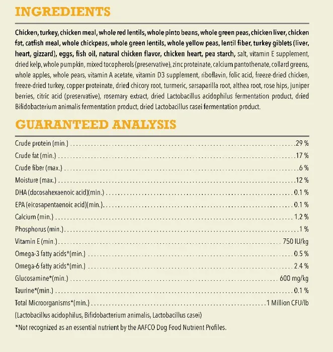 - 60% fresh, raw, or dried animal ingredients in nourishing WholePrey ratios; 40% vegetables, fruits, and botanicals