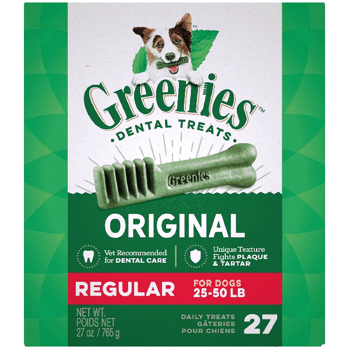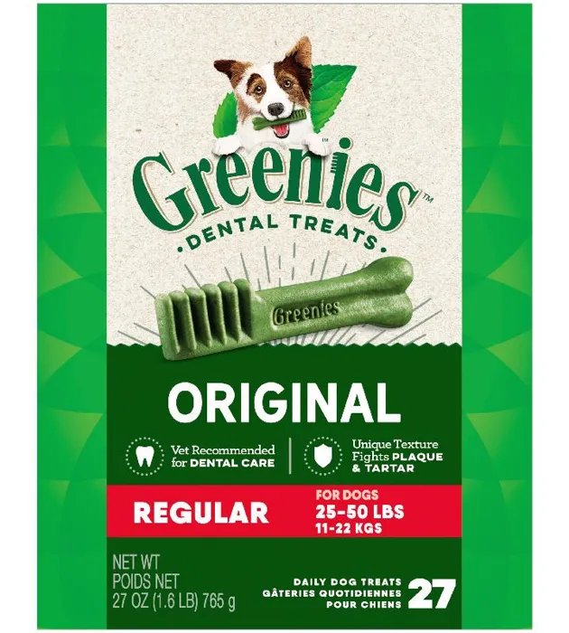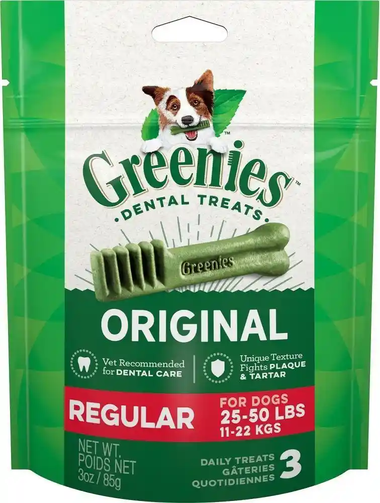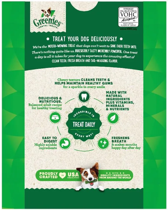 Made with a chewy texture to help fight plaque and tartar, Greenies Regular Original Dental Dog Chews are the perfect daily treat to help keep your pups teeth clean! These dental treats are all natural with easy to digest ingredients topped with a delicious, mouth-watering taste!