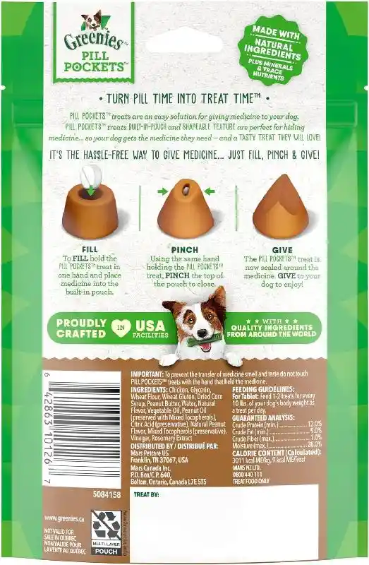Giving your pup medication no longer has to be a hassle! Greenies Pill Pockets Canine Peanut Butter Dog Treats are the perfect, low calorie way to disguise pills and eliminate the stress of giving your furry companion medicine. Greenies Pill Pockets Canine Peanut Butter Dog Treats mask both the smell and taste of the pills put inside!