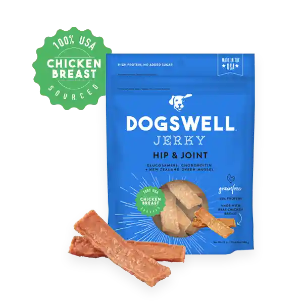 Reward your dog with the chunky, meaty flavor he craves with a little something extra inside. The Hip & Joint jerky treats from Dogswell are made with real chicken, for a treat that satisfies more than just his taste buds. That's because each flavorful bite helps to maintain his lean muscle mass with high-quality protein. How's that for a pick-me-up? With an additional boost from glucosamine, and chondroitin, these tasty jerky treats may even promote healthy joint function, too! So, while he's chomping on authentic, USA-made jerky, you can bask in the knowledge that his new favorite chew is a healthy, grain-free snack you trust. It's everything your dog has ever wanted, with everything you expect from a pet-loving company like Dogswell.