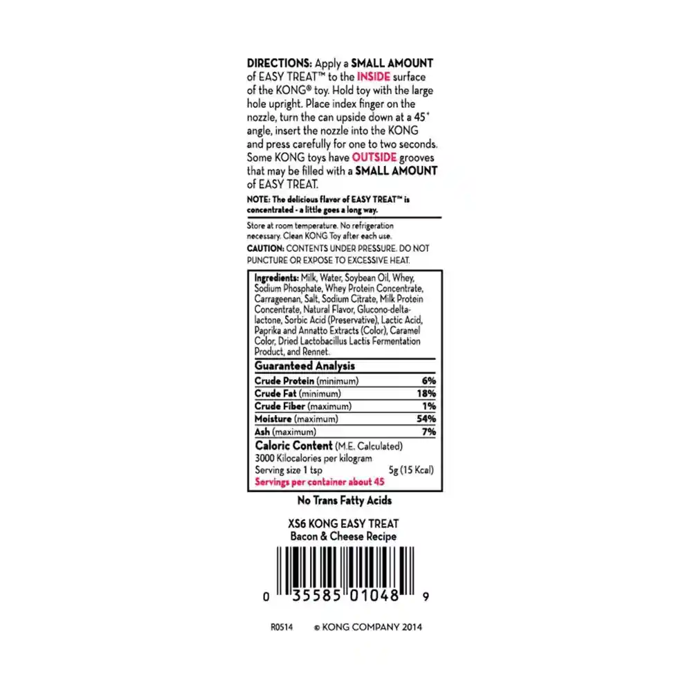 Playtime with your pal is now mess-free, hassle-free, and only a delicious dab away with the irresistible bacon and cheese flavor of the KONG Stuff'N Easy Treat Bacon & Cheese Recipe. With an easy-to-use, built-in nozzle, simply tilt and press to reward your best pal with a delectable treat anytime, or easily fill any KONG rubber toy for extended playtime. Your dog will love the delicious bacon and cheese flavor and lip-smacking texture! While he spends hours licking and savoring his favorite treat-stuffed KONG toy, you can feel good about providing a delicious, trans-fat free, highly-digestible reward. Freeze inside a KONG rubber toy for a longer-lasting, mentally-stimulating challenge.