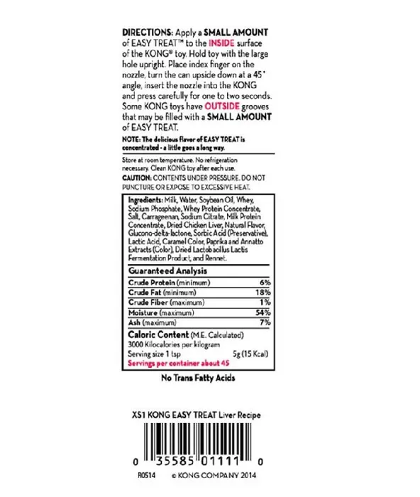 Playtime with your pal is now mess-free, hassle-free, and just a dab away with the irresistible liver flavor of the KONG Stuff'N Easy Treat Liver Recipe. With an easy-to-use, built-in nozzle, simply tilt and press to reward your best pal with a delectable treat anytime, or easily fill any KONG rubber toy for extended playtime. Your dog will love the delicious liver flavor and lip-smacking texture! While he spends hours licking and savoring his favorite treat-stuffed KONG toy, you can feel good about providing a delicious, trans-fat free, highly-digestible reward.
