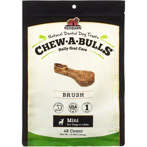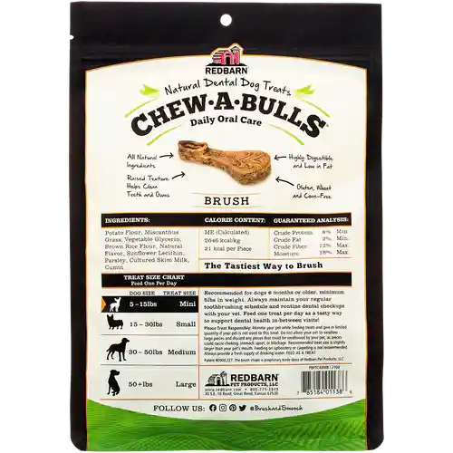 It's time to brush your teeth, but what about your pooch? Easy! Grab a Redbarn Chew-A-Bulls® dental treat for your dog to enjoy. This all-natural, limited ingredient treat comes in a variety of shapes, including hydrant, chip, brush, toad, and more. Fun ridges and grooves scrape your dog's teeth and gums, moving between those hard to reach places to fight tartar and control plaque. Made with rich spices like cumin and antioxidants like parsley, Redbarn Chew-A-Bulls® are easily digestible, highly palatable and the perfect pairing to your pup’s daily dental routine.