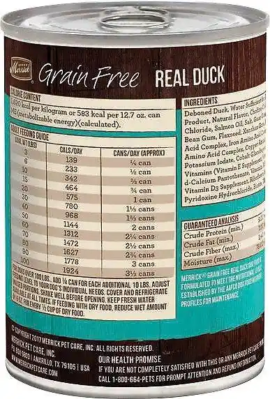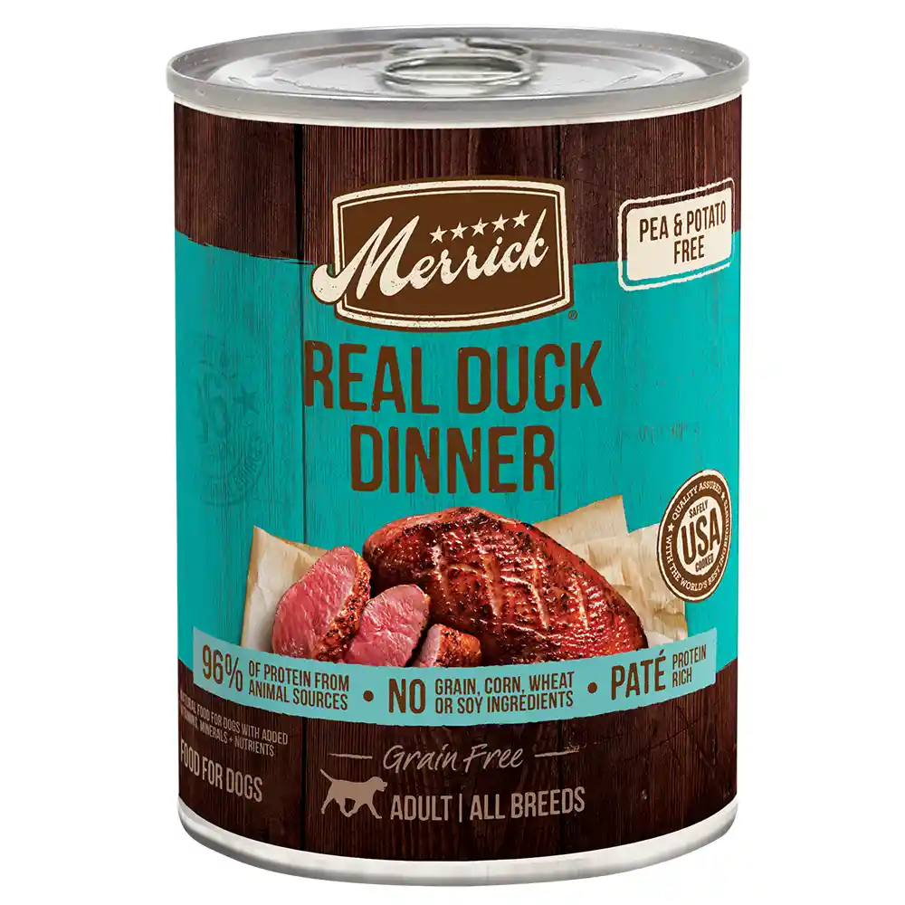 Nourish your pal with the complete and balanced nutrition of Merrick Grain-Free Real Duck Canned Dog Food. This grain-free stew is made with real deboned duck for good source of protein, plus a delicious turkey broth to add moisture and taste. The gluten-free recipe also contains added essential vitamins and minerals, such as vitamins E, B12, A and D3, plus a healthy blend of amino acids for your pal's overall health and well-being. This tasty meal can be served as a kibble topper or as a complete meal. Made safely in the USA in Merrick's own kitchen, this natural recipe is great for all adult breeds and does not contain artificial colors, flavors or preservatives.